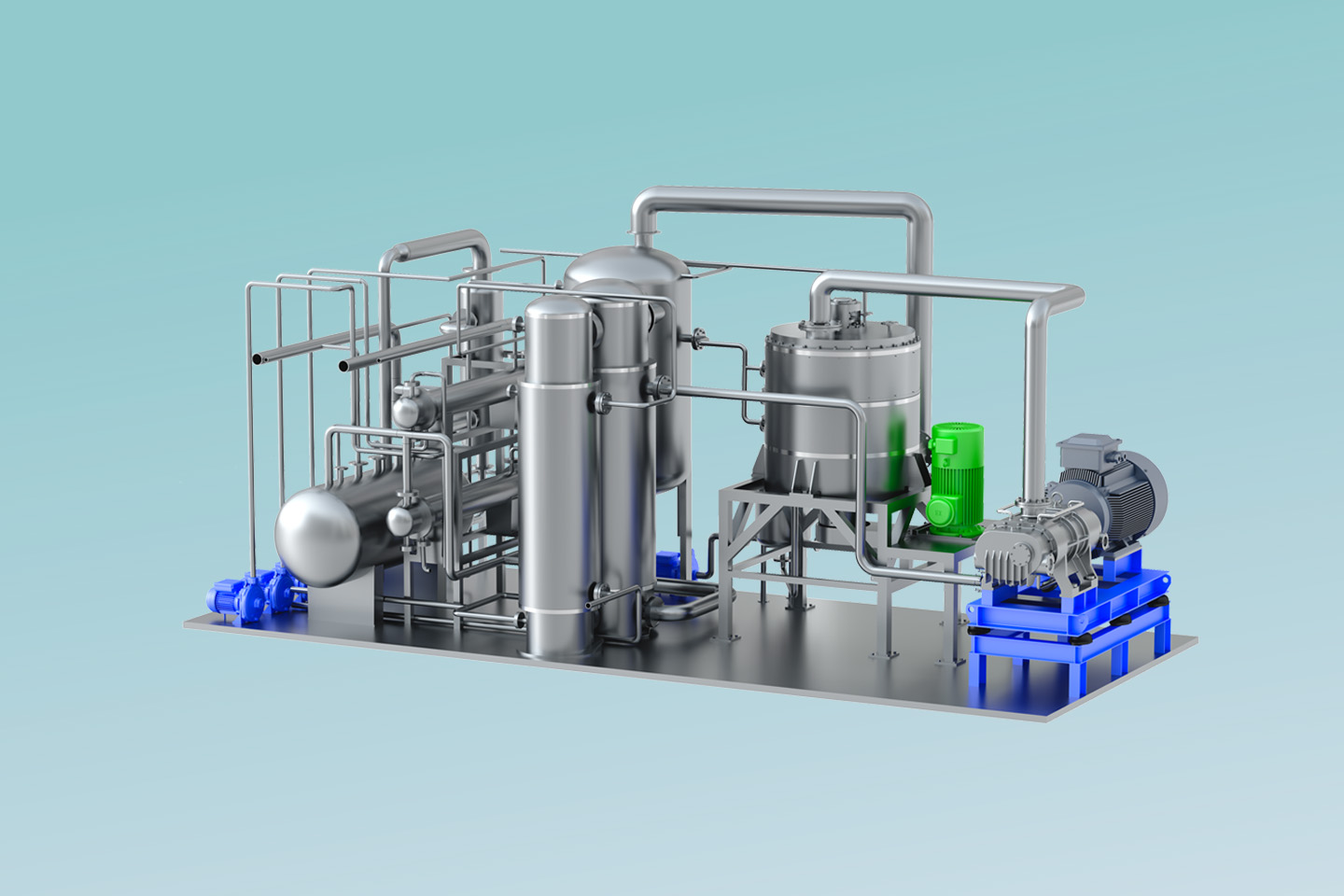 MVR熱泵精餾系統(tǒng)以高效旋轉(zhuǎn)精餾床為基礎(chǔ),利用離心力場代替重力場,強化相與相之間的相對速度和相互接觸,通過強化傳質(zhì)傳熱來提高分離效率縮小設(shè)備體積。 通過在系統(tǒng)中引入適用于小流量、大壓比的螺桿式蒸汽壓縮機,即可實現(xiàn)MVR循環(huán)熱泵精餾。